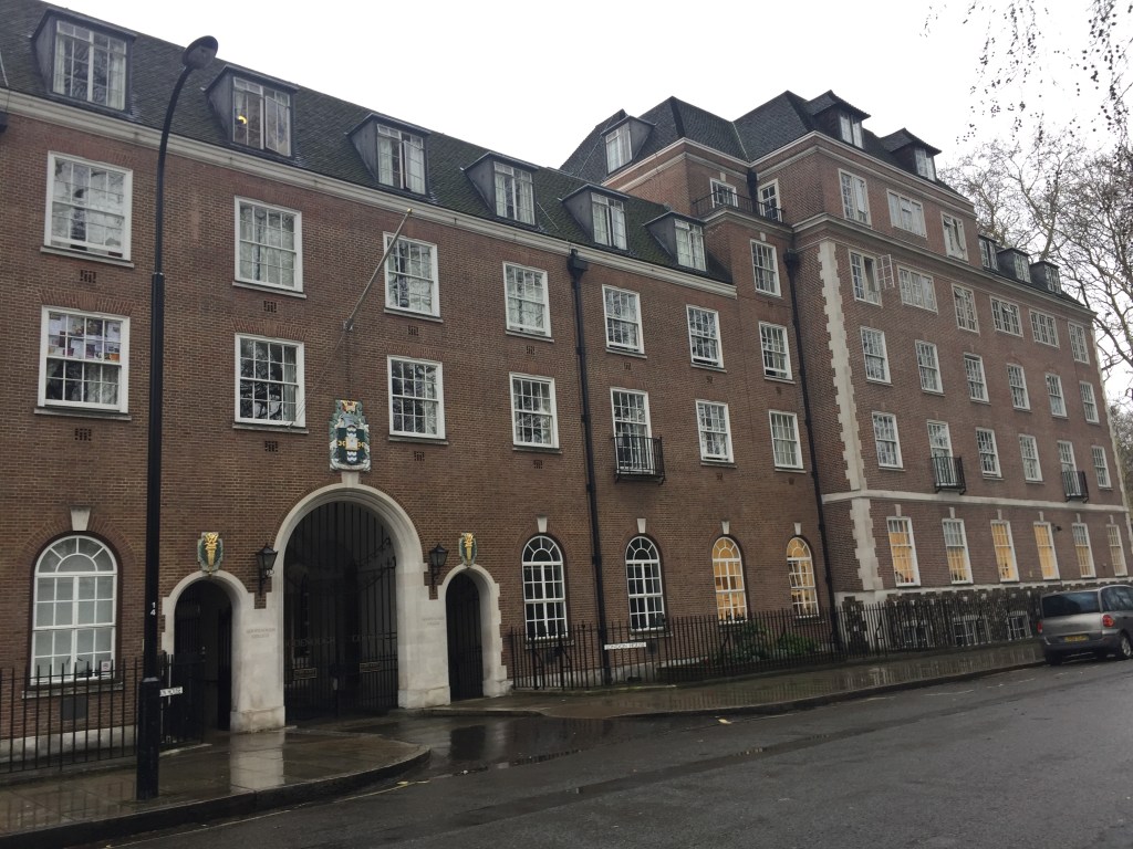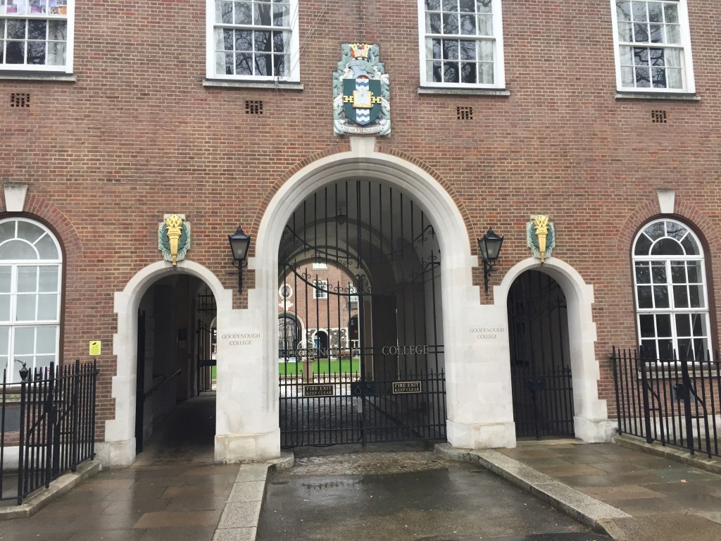 My next stop was Goodenough College, which has an number of properties on Mecklenburgh Square, which is a lovely peaceful square despite it being right in the heart of London near Kings Cross. Goodenough was founded in the 1931 by Frederick Crawford Goodenough who was Chairman of Barclays Bank, to house male graduate students from the commonwealth countries. Women were added in a separate building after WWII and then in the 1970s the intake was opened up to the rest of the world.