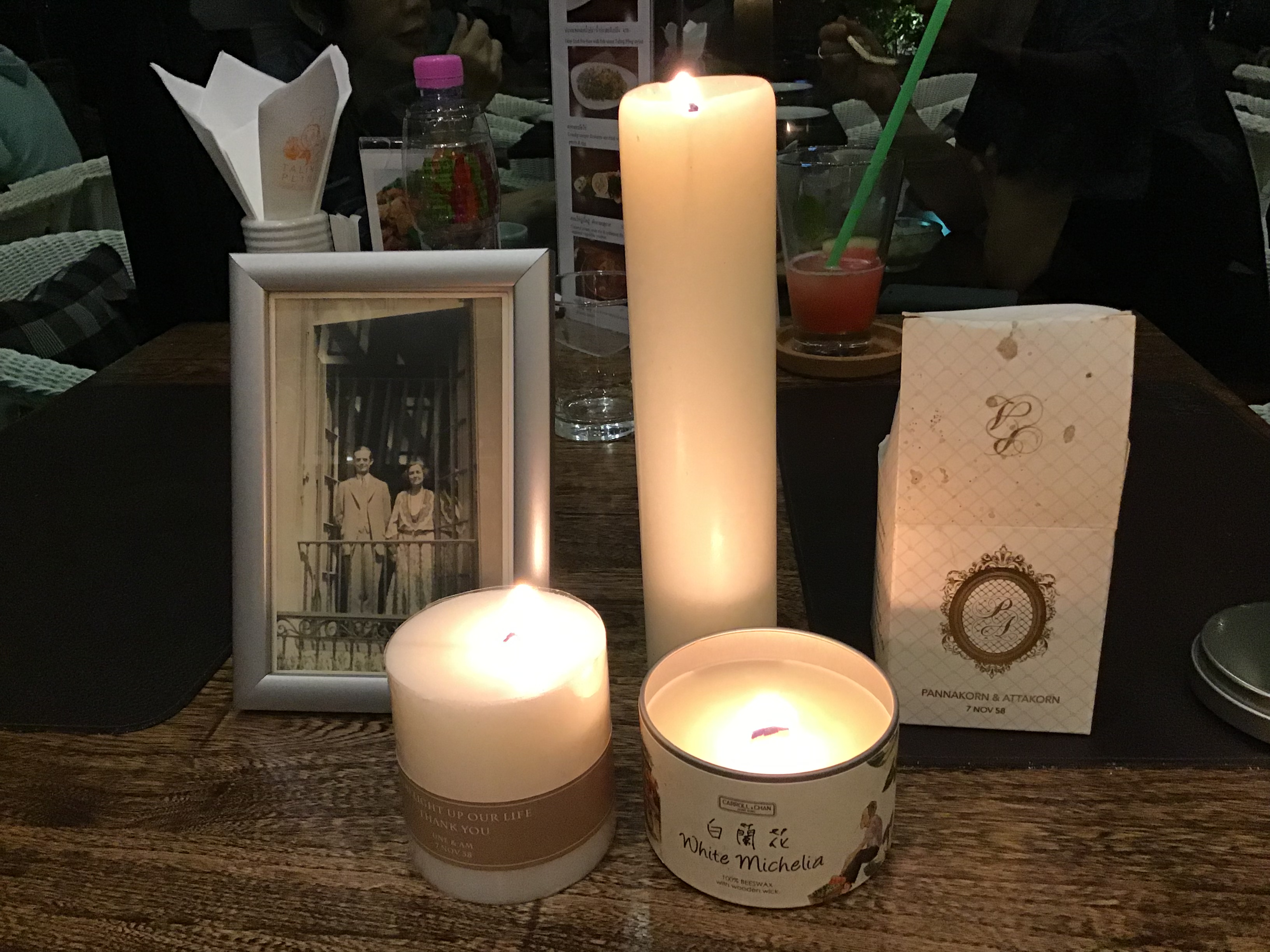 I passed on Nelson Fung’s Hong Kong candle with its delicious sent to Book, who gave me a very interesting candle to take on to Delhi. It is a candle from his friends wedding. They are a couple who met doing Cheer-Leading and married in 2015 – which in Thai years is 58.