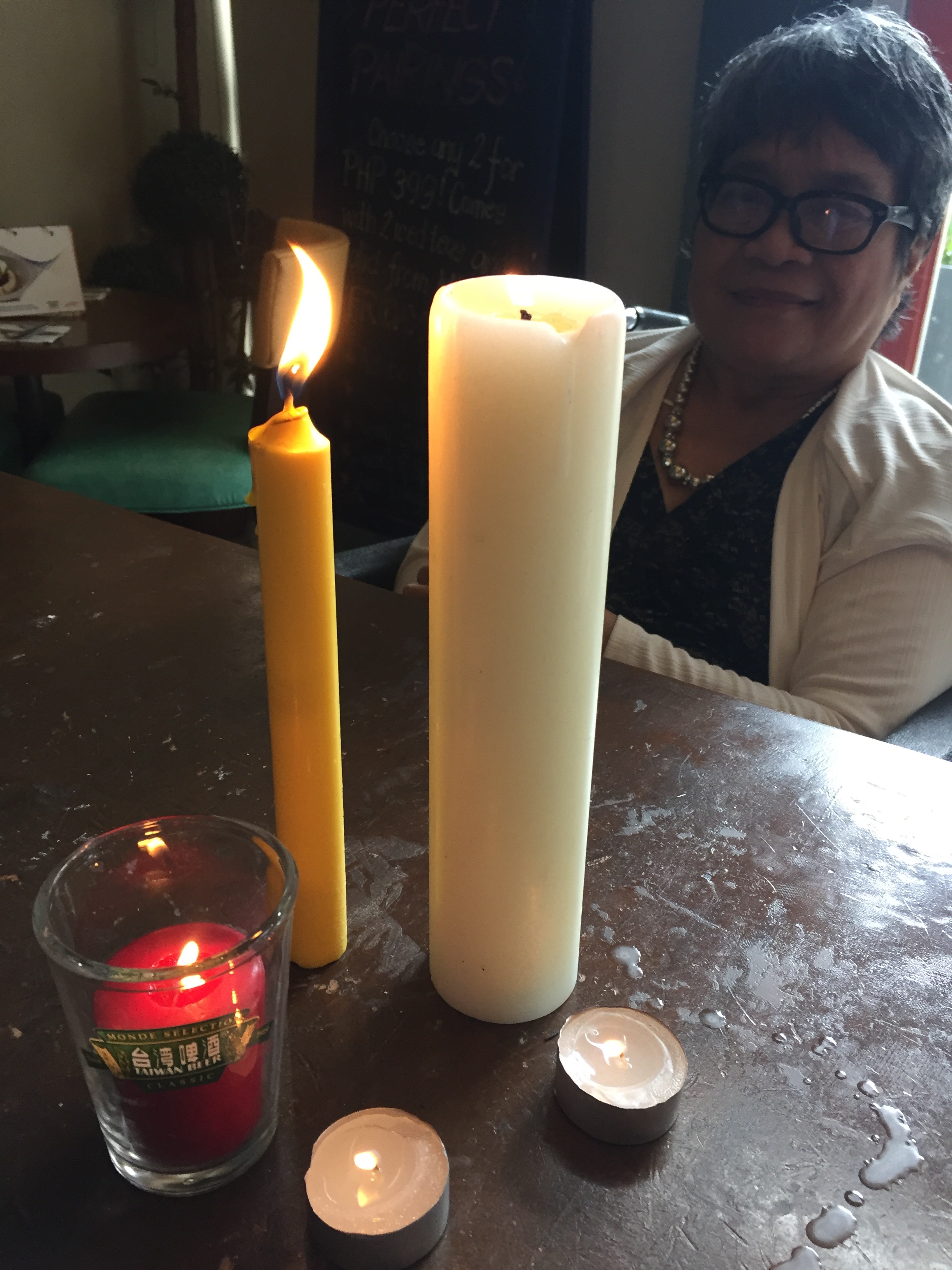 We continued my candle relay handing over the Taiwan candle in a Taiwan Beer Glass that Grace Hong gave me in Taipei, to Leah who had bought my Manila candle. It seems that Manila Wax Commercial have the monopoly on candles in Manila and Leah had chosen one of their Yellow ones (they come in White, Red or Yellow). I was also able to give Virginia and Neil one each of the tea light candles that Tudor had bought to the Taipei event.